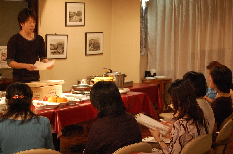 当日お持ち頂くのは「ペン」と「やる気」のみです。実演後の会食の前にはソムリエ学のユニークな!?ワインをテーマにしたワンポイントレッスンも展開中です。会食はシェフも交えワインとボリュームたっぷりの実演で作った美味しい料理をテーブルを囲んで召し上がります。ほろ酔いのシェフを魚に生徒さん同士の会話も弾みます。お一人で参加の方がほとんどなので気軽に参加できる料理教室です。ご不明な点はお気軽にお問い合わせください。